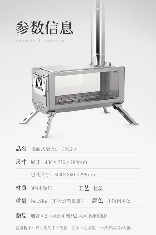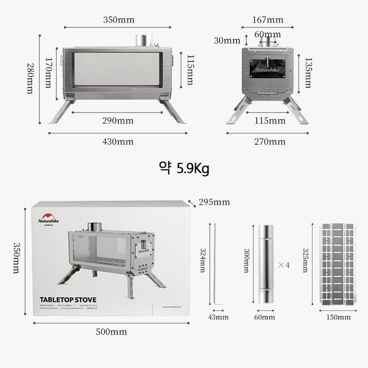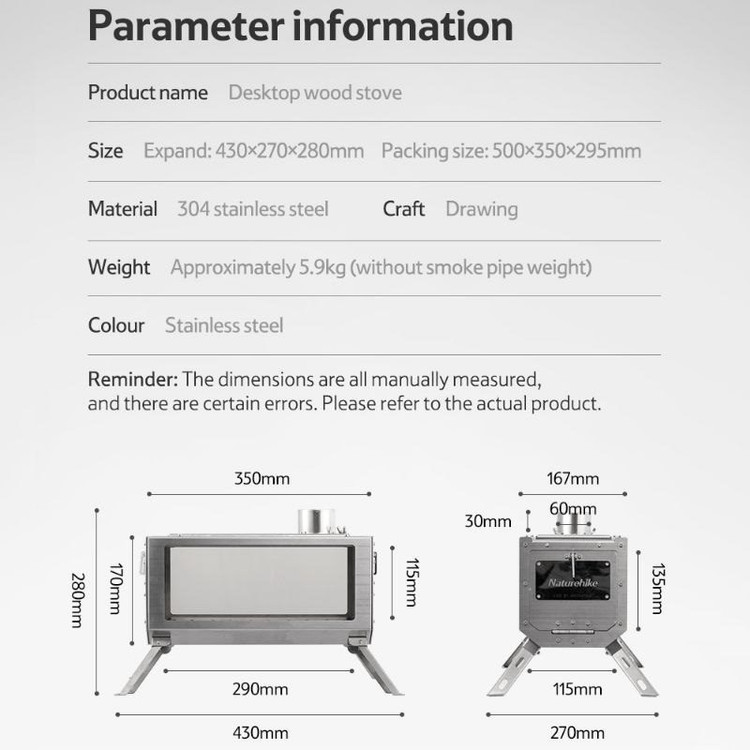 ابعاد این اجاق در حالت استفاده شده 280×270×430 میلیمتر است و در حالت بستهبندی به ابعاد 295×350×500 میلیمتر میرسد. این ابعاد به گونهای طراحی شده است که اجاق فضای زیادی را اشغال نمیکند و در عین حال عملکردی قدرتمند و کارآمد دارد. وزن این اجاق معادل 5.9 کیلوگرم (بدون احتساب لوله دود) است که برای یک اجاق هیزمی که به راحتی میتوان آن را حمل کرد، وزن مناسبی به شمار میآید. لولههای دود اجاق نیز با وزن 246 گرم و ابعاد 300×60 میلیمتر در طراحی آن قرار دارند که در مجموع از جنس فولاد ضد زنگ 304 هستند و از دوام و کارایی بالایی برخوردارند.