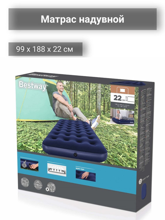- تشک بادی یک نفره دارای ابعاد ۹۹×۱۸۸ سانتیمتر است که مناسب برای یک نفر است. ارتفاع این تشک ۲۲ سانتیمتر بوده که از راحتی و حمایت مناسب در طول شبانهروز برخوردار است.