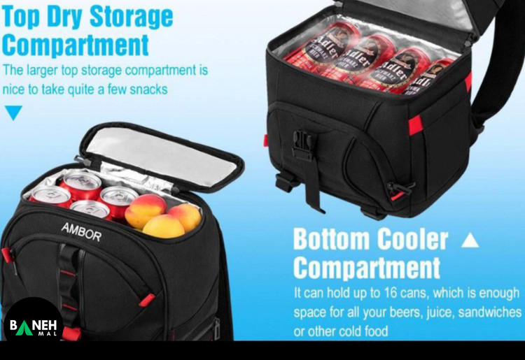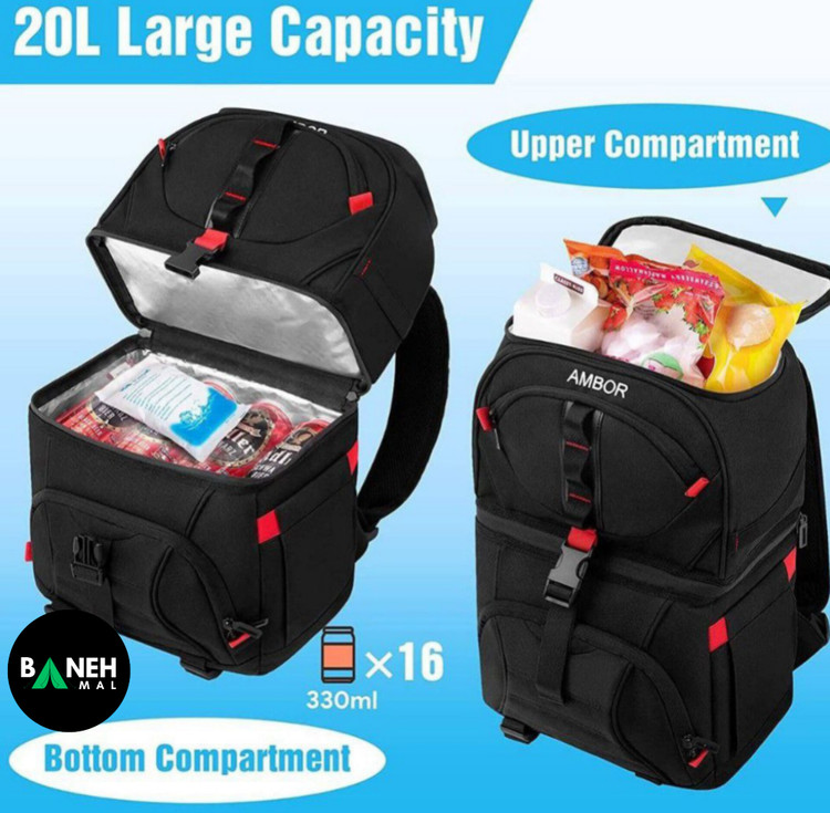کیف کول بک دار AMBOR دارای دو محفظه مجزا در قسمت بالا و پایین است که امکان سازماندهی و تفکیک وسایل مختلف را فراهم میآورد. این طراحی به شما این امکان را میدهد که مواد غذایی یا نوشیدنیها را بهصورت جداگانه و منظم درون کیف قرار دهید. همچنین این دو محفظه میتواند بهعنوان فضای مجزا برای نگهداری اقلام مختلف مانند نوشیدنیهای سرد و غذاهای گرم استفاده شود.