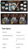 وزن و ابعاد مناسب برای حمل و نقل: این اجاق هیزمی با وزن 9.6 کیلوگرم بهخوبی تعادل بین استحکام و حملونقل آسان برقرار کرده است. باوجود وزن نسبتا زیاد، ابعاد آن در حالت بسته تنها 23.1*25*38.2 سانتیمتر است، که به شما این امکان را میدهد تا به راحتی آن را در صندوق خودرو یا کولهپشتی خود حمل کنید. زمانی که اجاق باز شود، ابعاد آن به 35*31.5*45.5 سانتیمتر میرسد، که فضای کافی برای استفاده بهینه از اجاق را فراهم میکند.