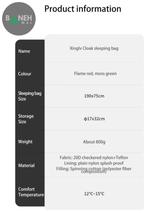 این کیسه خواب شنل دارای ابعاد ۱۸۰ * 75 سانتیمتر است که فضای کافی برای خوابیدن راحت یک فرد را فراهم میکند. این اندازه مناسب به گونهای طراحی شده که به شما امکان حرکت و استراحت در داخل آن را میدهد، به خصوص زمانی که نیاز به خوابیدن در فضای محدود دارید.