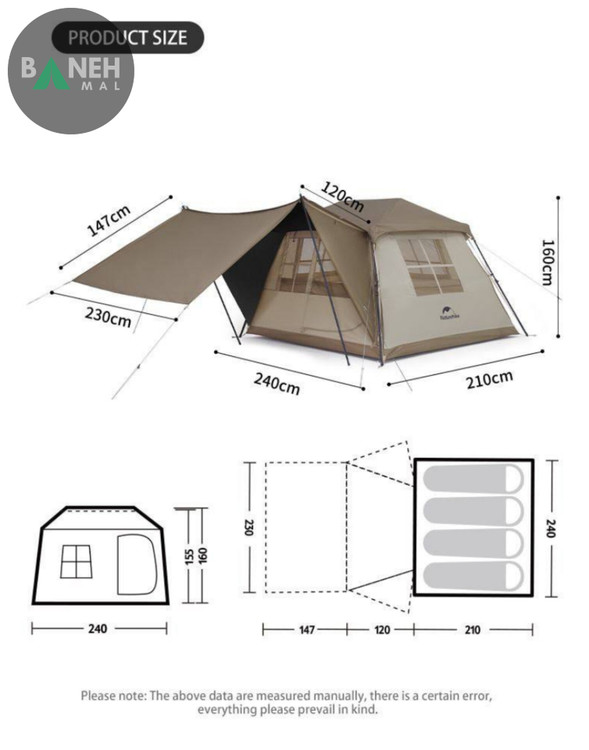یکی از ویژگیهای برجسته این چادر، سایبان بزرگ آن است که ابعاد آن ۱۵۰×۲۲۰ سانتیمتر است. سایبان باعث میشود که در زمانهای بارانی یا آفتابی، فضای اضافی برای استراحت یا نگهداری وسایل شما ایجاد شود. این ویژگی بهویژه برای حفاظت از وسایل حساس یا هنگام غذا خوردن در فضای باز بسیار مفید است.