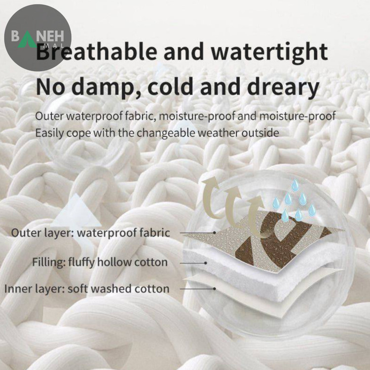 پوشش خارجی کیسه خواب از پلی استر ۲۱۰T ساخته شده است که مقاوم و بادوام است و در برابر رطوبت و شرایط جوی مختلف مانند باران و باد محافظت میکند. پلی استر همچنین قابلیت شستوشوی آسان را فراهم میآورد و از چروک شدن زیاد جلوگیری میکند.