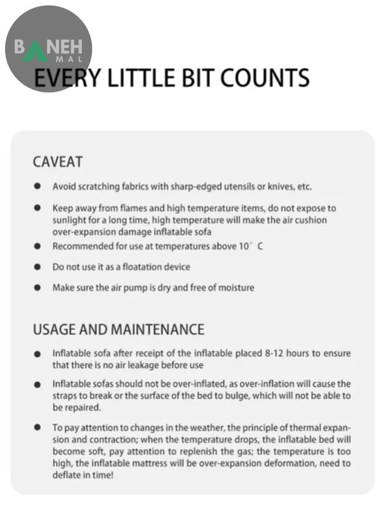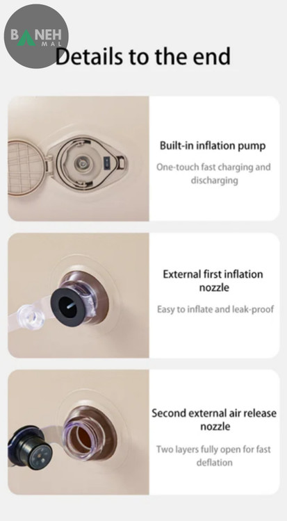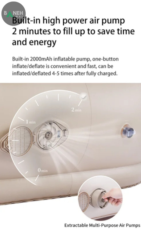 این کاناپه بادی به همراه پمپ باد عرضه میشود که امکان باد کردن سریع و راحت آن را فراهم میآورد. پمپ باد برای افرادی که به زمان و راحتی اهمیت میدهند، بسیار مناسب است. بهویژه زمانی که نیاز به باد کردن سریع کاناپه بادی برای استفاده فوری دارید، این پمپ میتواند در کمتر از چند دقیقه کاناپه را آماده استفاده کند. از آنجا که پمپ باد به همراه محصول ارائه میشود، دیگر نیازی به خرید جداگانه پمپ باد نخواهید داشت، که این خود یک مزیت بزرگ است.