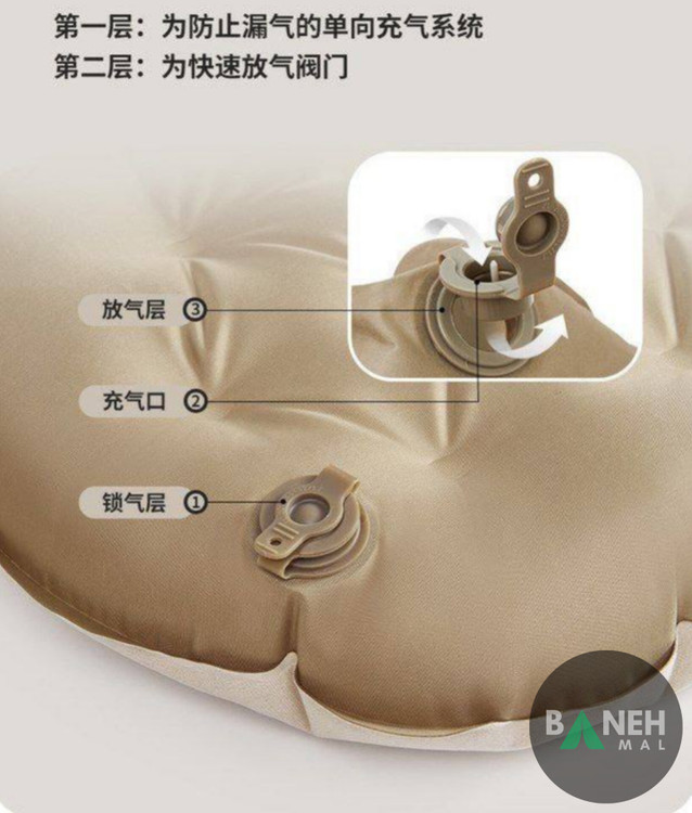 دکمه باد شدن و خالی شدن باد: یکی از ویژگیهای برجسته این بالش، تعبیه دکمهای جهت باد شدن و خالی شدن باد است. این دکمه به شما این امکان را میدهد که به راحتی و در کمترین زمان ممکن، بالش را باد کرده و آماده استفاده کنید. همچنین برای تخلیه باد، میتوانید با فشار دادن دکمه، باد را به سرعت از داخل بالش خارج کرده و آن را جمع کنید. این ویژگی باعث میشود که استفاده از بالش بسیار سریع و راحت باشد و نیازی به زمان زیادی برای باد کردن یا تخلیه باد نداشته باشید.