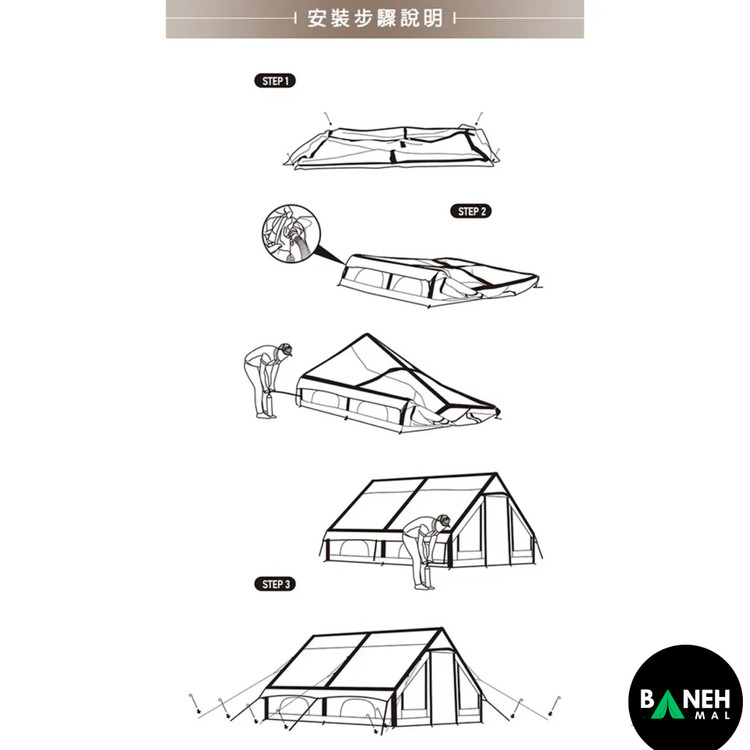 شامل چادر، پمپ باد دستی ، 6 طناب مهار، 22میخ فلزی برای تثبیت، و کاور حمل مخصوص