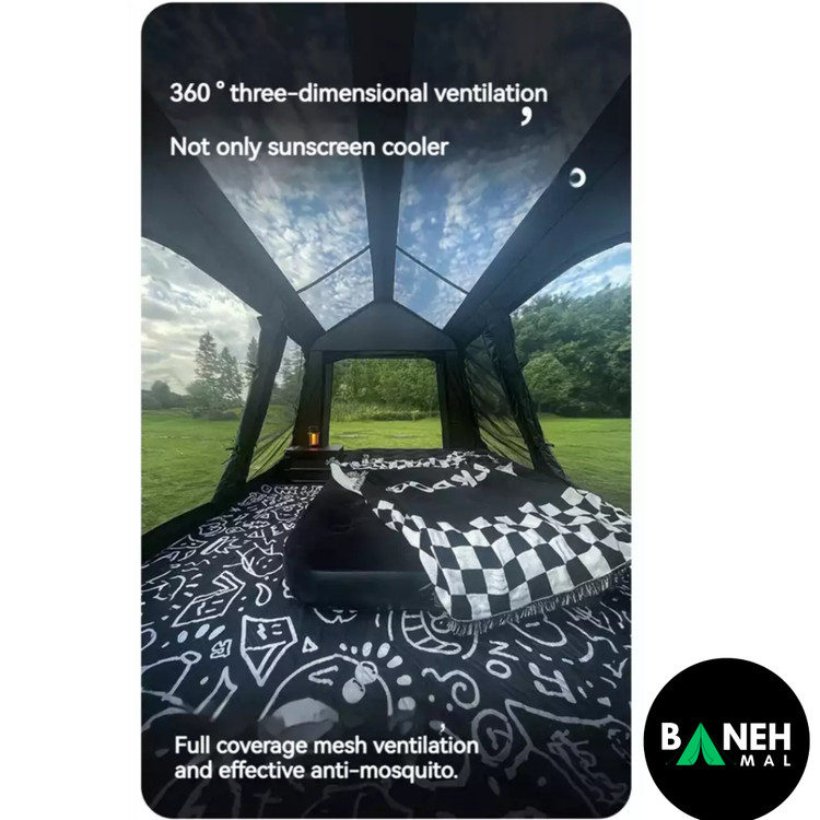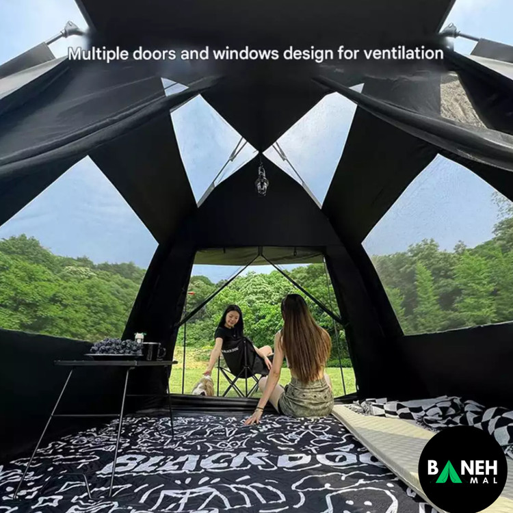 وجود چندین درب و پنجره توریدار در این مدل، موجب تهویه مناسب هوا و جلوگیری از ورود حشرات مزاحم میشود. با باز بودن پنجرهها، جریان هوا در طول شب یا روز حفظ شده و از تجمع بخار یا بوی ناخوشایند درون چادر جلوگیری میشود.
