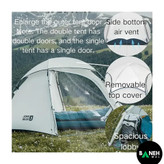 وجود دو درب و یک پنجرهٔ تهویه در این چادر، امکان جریان هوای تازه را فراهم کرده و مانع از تجمع رطوبت داخل چادر میشود. این موضوع بهویژه در فصلهای مرطوب و هنگام کمپینگهای طولانی اهمیت زیادی دارد.
