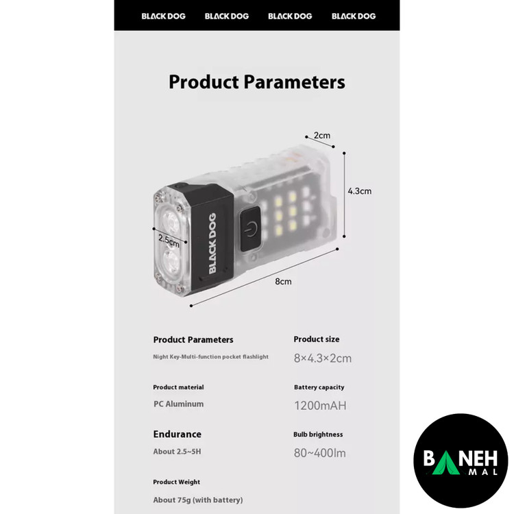 چراغ قوه بلکداگ با بدنهای از ترکیب پلاستیک PC و آلومینیوم ساخته شده است که مقاومت بالایی در برابر ضربه و فشار دارد. وزن سبک ۷۵ گرم و ابعاد کوچک ۲×۴.۳×۶ سانتیمتر، حمل و نگهداری آن را بسیار آسان کرده است. این ساختار heavy-duty، محصول را در برابر استفاده طولانی و شرایط محیطی سخت مقاوم میسازد.