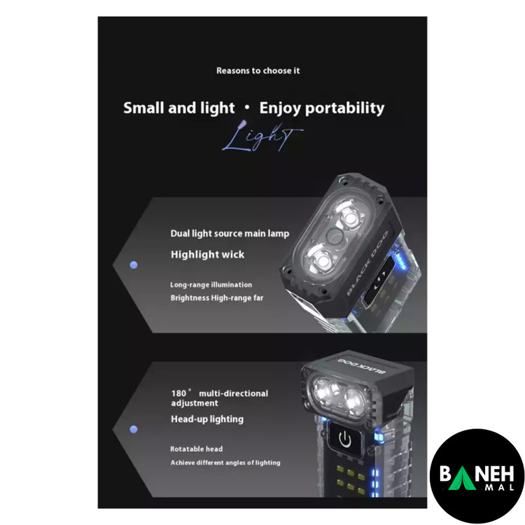 یکی از ویژگیهای برجسته چراغ قوه بلکداگ، قابلیت چرخش ۱۸۰ درجهای است. این ویژگی انعطافپذیری فوقالعادهای به محصول میدهد و امکان استفاده به عنوان چراغ پیشانی یا چراغ رومیزی را فراهم میکند. بنابراین کاربر میتواند زاویه نور را متناسب با نیاز خود تنظیم کند.