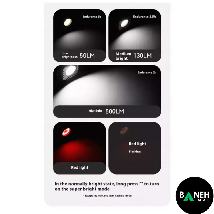 شدت روشنایی از 50 الی 600 لومن، زمان روشنایی 2 تا 8 ساعت و قابل تنظیم در سه دمای رنگی