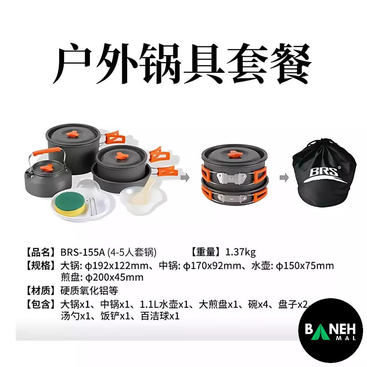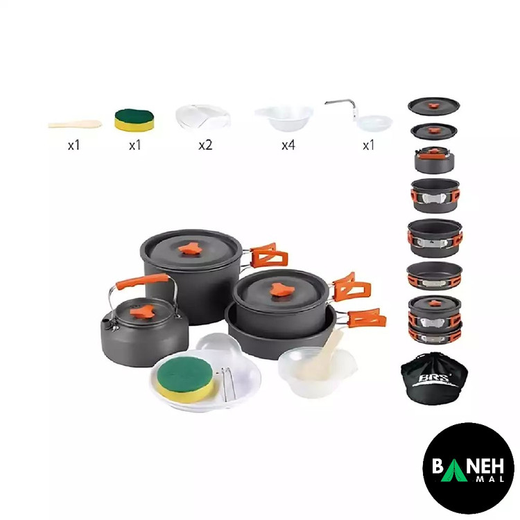 ست BRS-155A برای ۴ تا ۵ نفر طراحی شده و شامل قابلمهها، کتری، تابه و لوازم جانبی مورد نیاز برای یک وعده غذایی کامل است.
