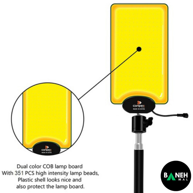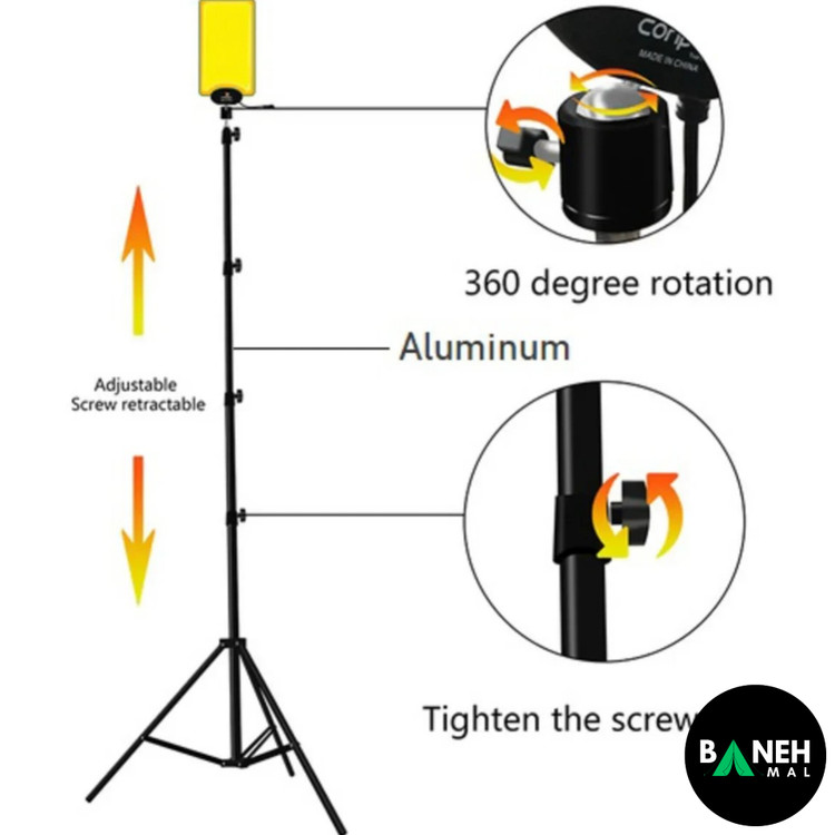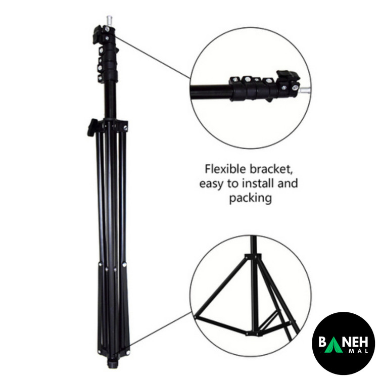اقلام همراه : پنل لامپ، ریموت کنترل از راه دور، شارژر فندکی ماشین، کیف مخصوص حمل، گیره باتری، کابل 6 متری، سه پایه 3 متری