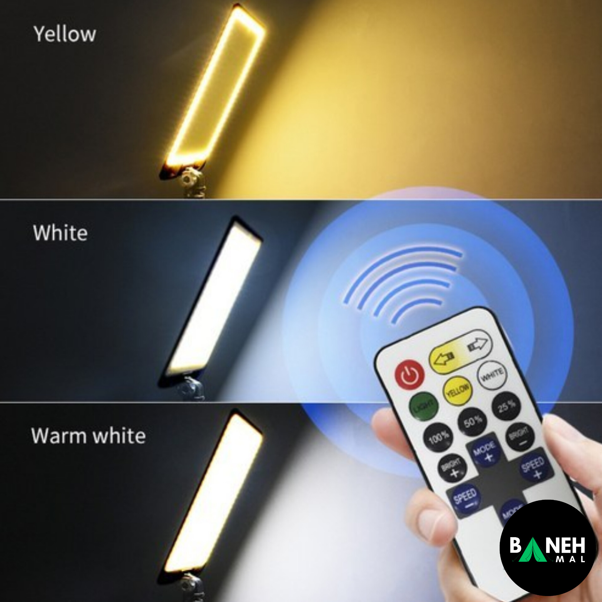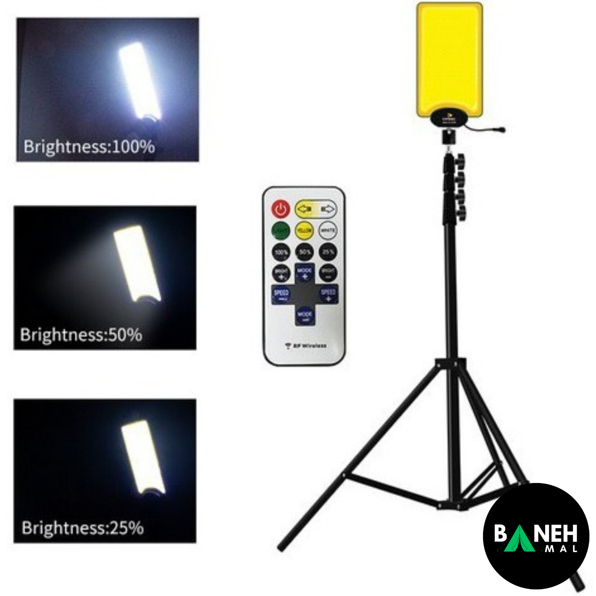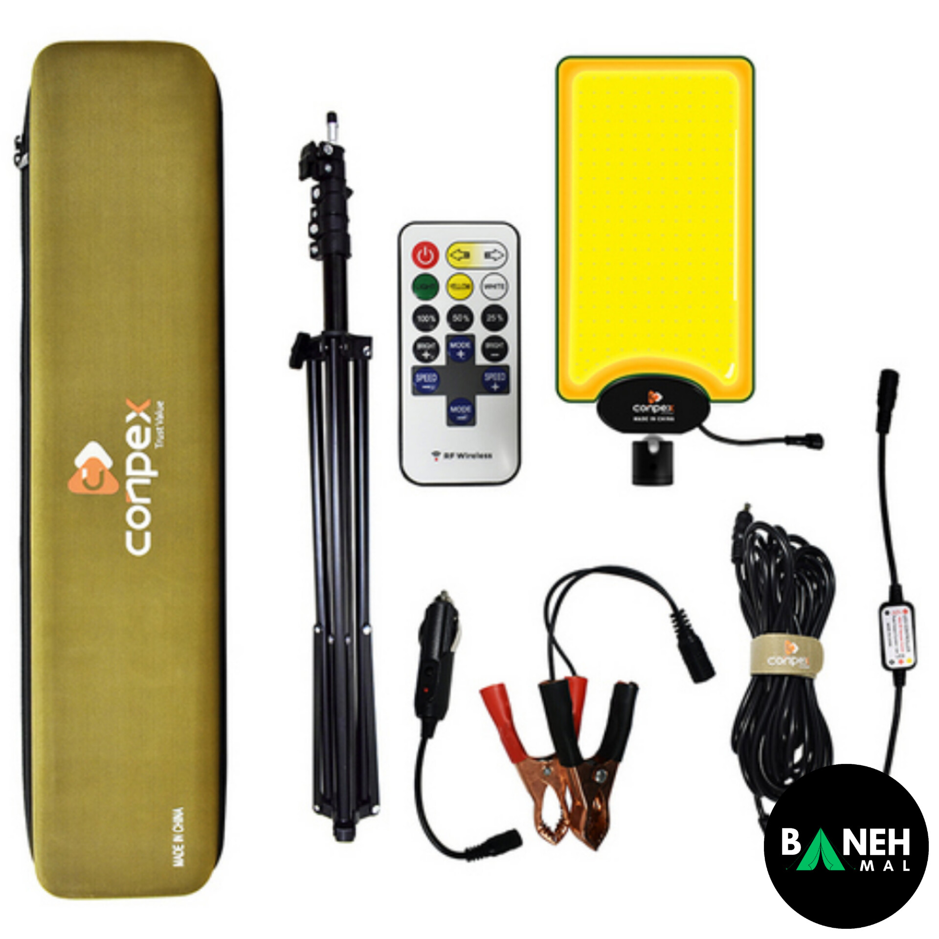 اقلام همراه : پنل لامپ، ریموت کنترل از راه دور، شارژر فندکی ماشین، کیف مخصوص حمل، گیره باتری، کابل 6 متری، سه پایه 3 متری