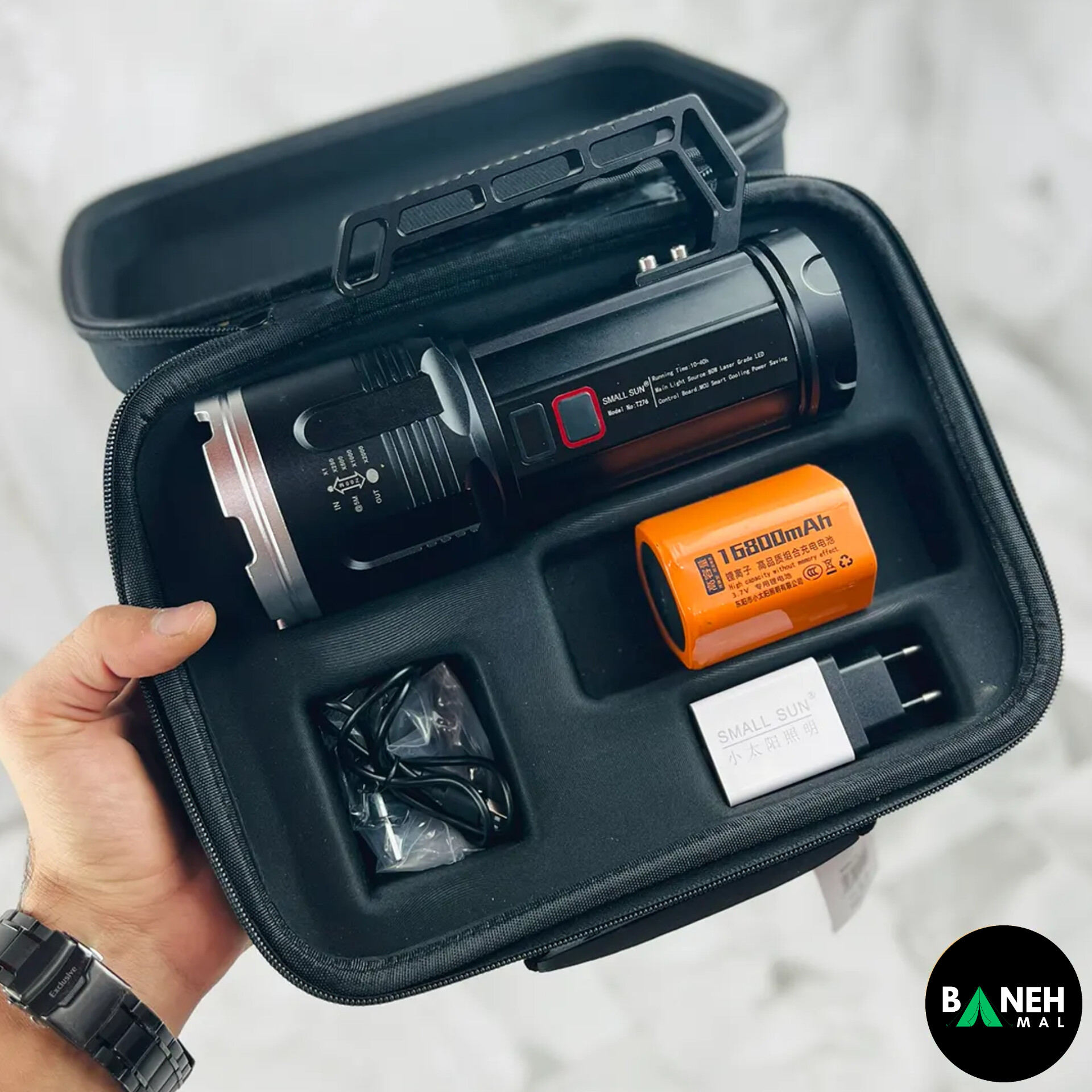 بند نگهدارنده ، جعبه حمل ، دسته فلزی قابل نصب ، کابل شارژ و آداپتور