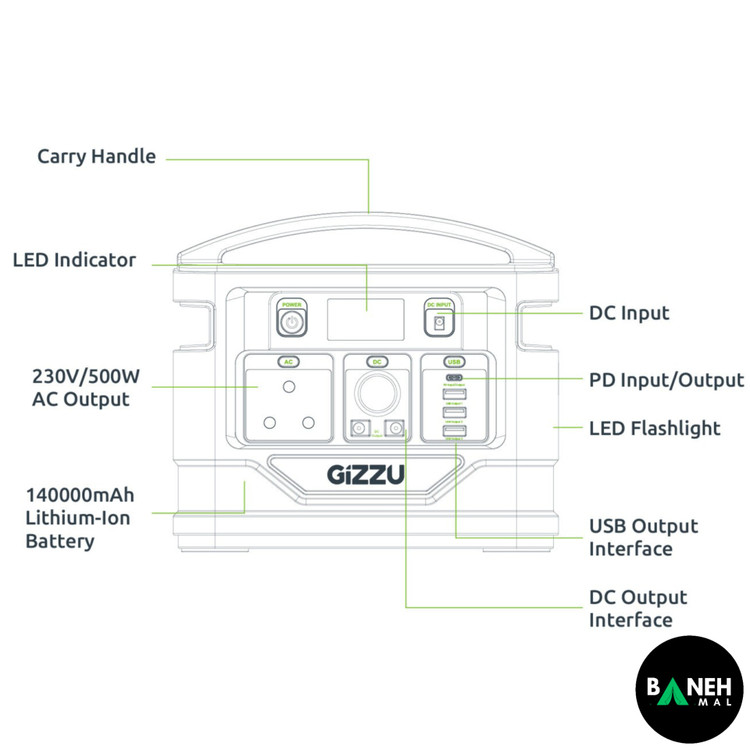 پاور استیشن Gizzu GPS500 به انواع خروجیهای کاربردی مجهز شده است:
