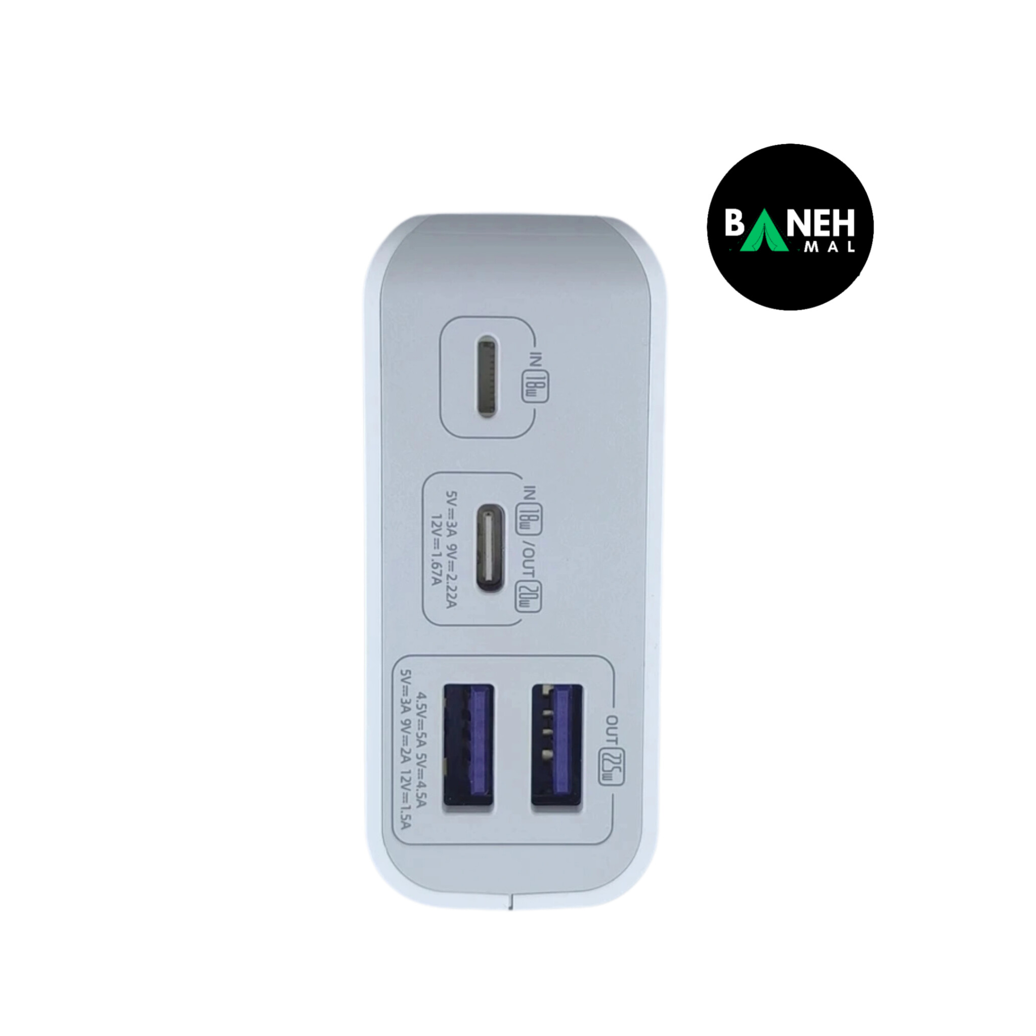 دارای پورت ورودی Lightning و Type-C / دارای پورت خروجی Type-C و USB.3 / توان خروجی تا 22.5 وات / دارای چراغ LED نمایشگر میزان شارژ